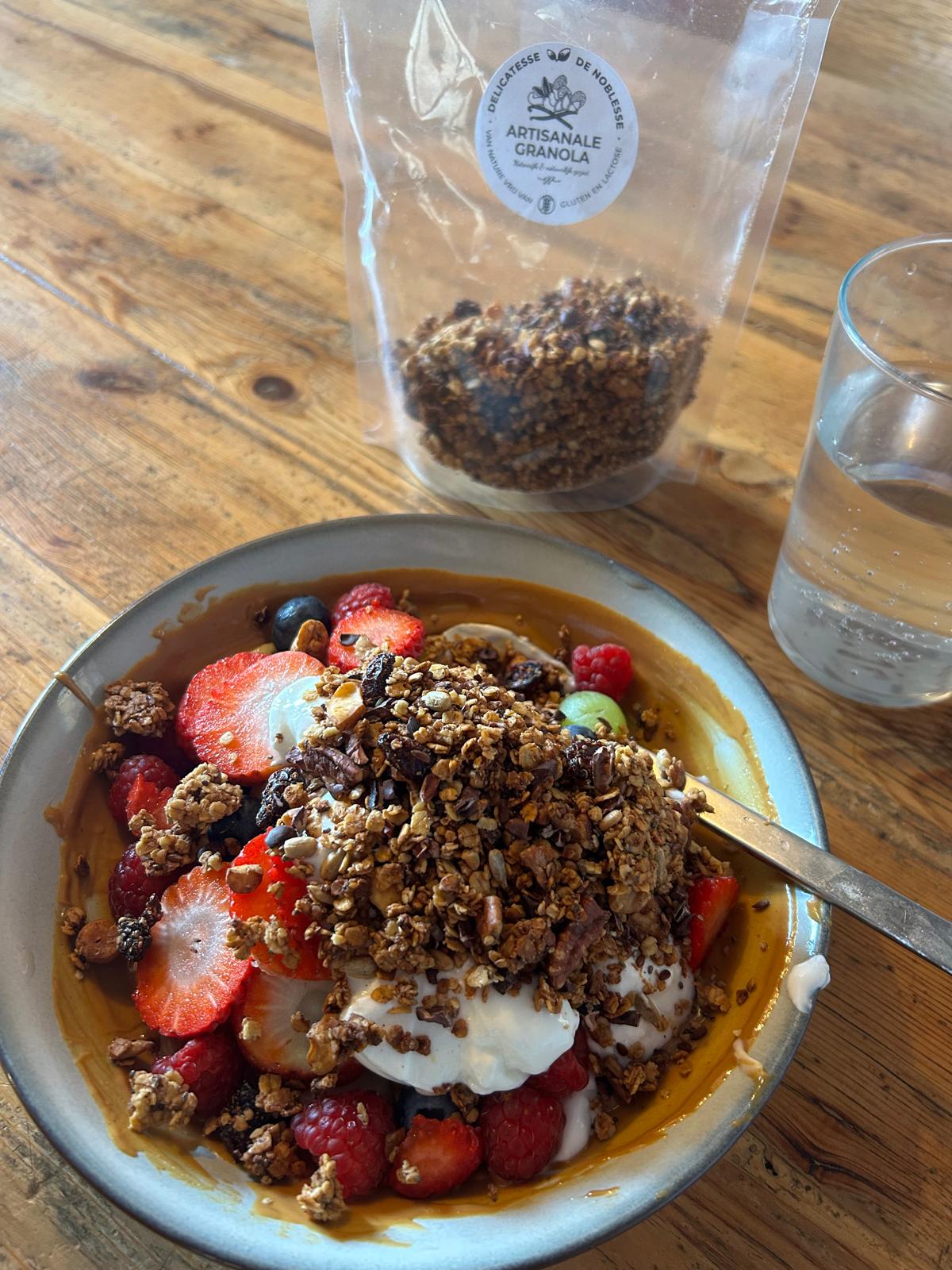 Our artisanal granola is baked in small batches using simple, natural ingredients. The base consists of gluten-free oats combined with nuts, seeds and cacao nibs for a rich texture and nourishing composition.